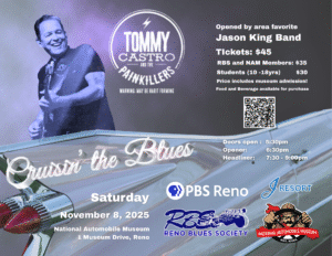 Don’t miss our 2nd Cruisin’ The Blues at the National Automobile Museum!  We are excited to be welcoming Tommy Castro and the Painkillers as our headliner, with Jason King Band opening.  The amazing museum venue becomes the perfect space to dance or listen your night away.